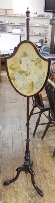 19th century polescreen with embroidered floral decoration in shield-shape panel, on tapered and bobbin supports, cabriole legs, 150cm high