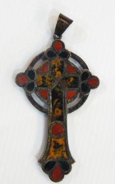 Victorian Scottish hardstone cross pendant in the form of a Celtic cross, with trefoil ends and openwork circle, the reverse with formal foliate engraving, 8cm