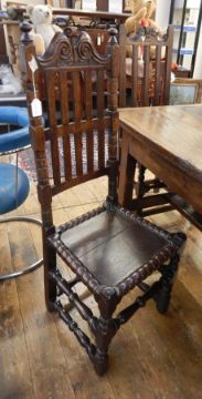 Pair 17th century oak railback dining chairs, each having scroll cresting, turned finials to the uprights, bobbin moulding around panel seat and turned stretchers