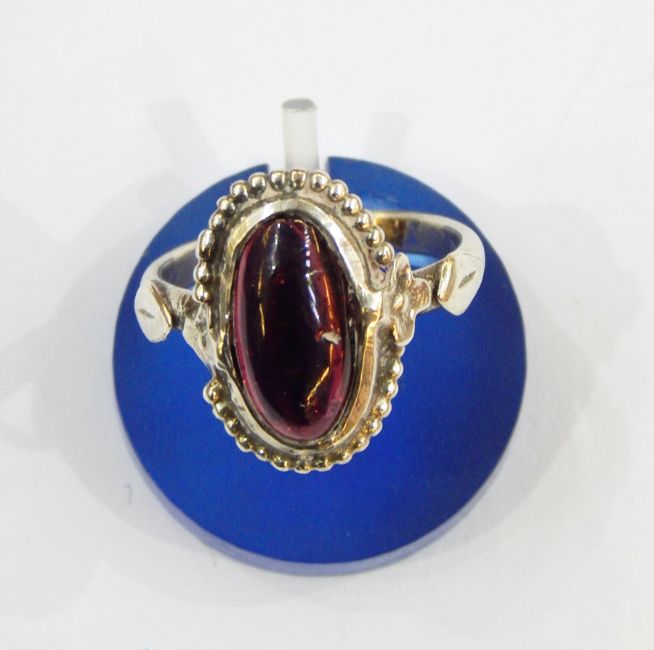 1960's designer gold-coloured metal and topaz ring by Maughan Harvey (silversmith and goldsmith who studied under George and Henry Hart, Chipping Camden, 1940's to 1980's), elliptical design and another, similar by the same designer, silver-coloured metal and garnet