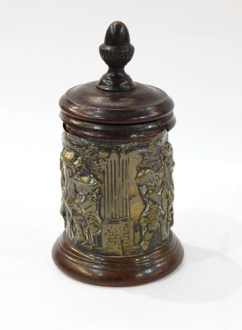 Antique turned oak and bronze tobacco jar, cylindrical, the lid with acorn finial and the bronze body embossed with tavern scenes, 22cm high