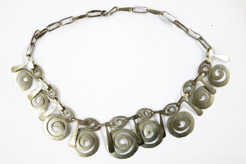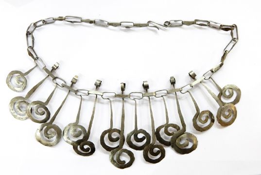 Two 1950's French hammered pewter necklaces exhibited in the Vallauris Exhibition, in which Picasso also exhibited, each necklace with graduated scroll pendants (with original black and white photograph postcard of the exhibition)