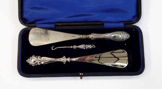 Edwardian silver-handled set comprising pair of shoelifts and button hook, cased together with silver sherry decanter label