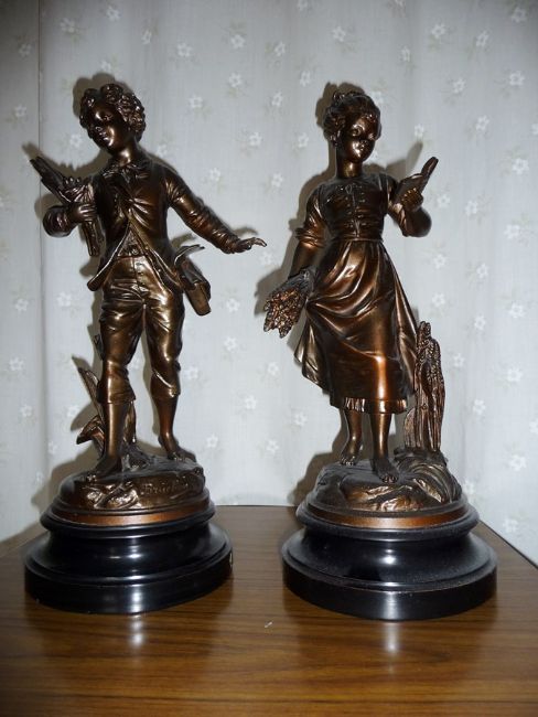 A pair of French Spelter figures of a young boy holding a birds nest 'L'ecole Buissonniere' and a young girl carrying a sheaf of wheat and reading a book 'La Studieuse' signed 'Brouchon' each on turned socle, 40cm high