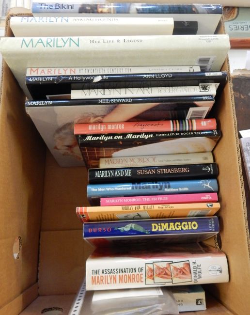 Marilyn Monroe - a quantity of books on her life and films including:- Strasberg, Susan "Marilyn and Me" Smith, Matthew "The Men who Murdered Marilyn" "Marilyn Monroe - Fragments" "Marilyn in Art", etc. Two posters "The Asphalt Jungle" and "Some Like it Hot", small 20th Century Fox poster "How to Marry a Millionaire" and a musical score for "Kiss", music by Lionel Newman from the film "Niagra", a 20th Century Fox advertisement in Spanish "Los Caballeros las Prefieren Rubias (Gentlemen Prefer Blondes)", a Marilyn Monroe 2002 unopened calendar, a quantity of black and white postcards and Panorama Magazine in Spanish from 2002, with photographs of Marilyn