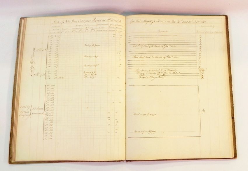 Early 19th century large folio sized ledger recording the State of New Iron Ordnance approved at Woolwich on his Majesty's service, predominantly, also State of Old Iron Guns late belonging to HM Ship Isis, reproved at Woolwich, bearing various company and persons names, vellum bound, gilt royal crest, dated in pencil on cover 1801-1803 (af)