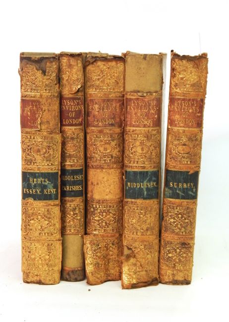 Lysons, Rev Daniel "The Environs of London: being an historical account of the towns, villages and hamlets...", printed by A Strahan for T Cadell Jun and W Davies 1796, volume I being the "County of Surrey", volume II the "County of Middlesex" 1795, volume III the "County of Middlesex" 1795 and volume IV the "Counties of Herts, Essex and Kent" 1796, frontis maps to volumes I, II and IV, numerous plates some folding, engraved vignettes on title pages "A Historical Account of those Parishes in the County of Middlesex...", pub.1800, all bound in tree calf, gilt edges, all backstrips rather worn with some loss (not collated) (5)
