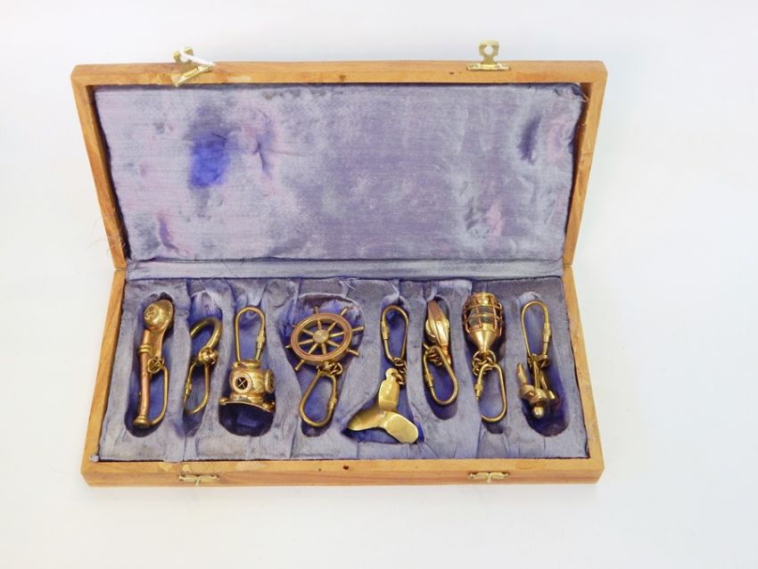 Nautical key rings to include a bosun's whistle, diver's helmet, wheel, propeller and others