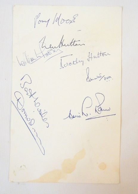 A signed RAF Cricket Umpires and Scorers Association 25th anniversary menu, on verso 'Best wishes Len Hutton, Dorothy Hutton, Tony Moore and others'