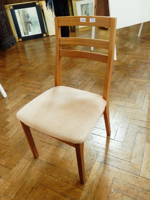 A set of six Nathan Furniture ladder back dining chairs with stuffover upholstered seats on square legs (6 singles)