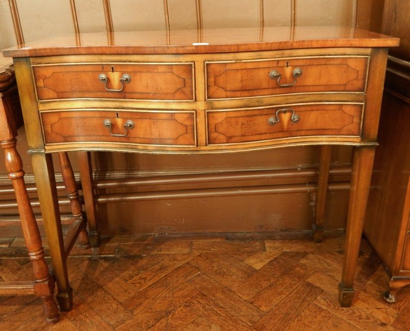 Reproduction yew wood veneer serpentine front chest of four short drawers, on square tapering legs with splayed feet, width 100cm