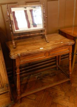 Oak folding swivel top tea table, with two frieze drawers, on turned splayed legs united by stretchers, width 89cm
