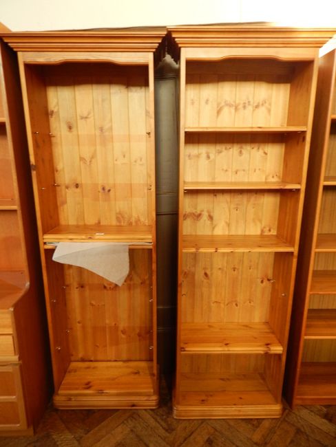 Pair of modern pine open bookcases with five adjustable shelves, on plinth base, width 64cm