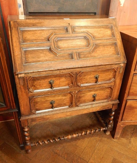20th century Jacobean-style oak bureau with panelled fall, enclosing fitted interior, with two long drawers below, on turned spiral supports united by stretchers, width 75cm