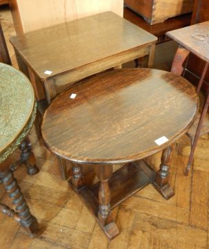 Oak two-tier occasional table on square tapering legs, 52cm, oval topped occasional table on tapered and bobbin supports united by stretcher (2)