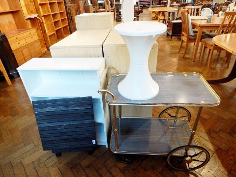20th century plastic stool white open bookcase, tea trolley and folding table (4)