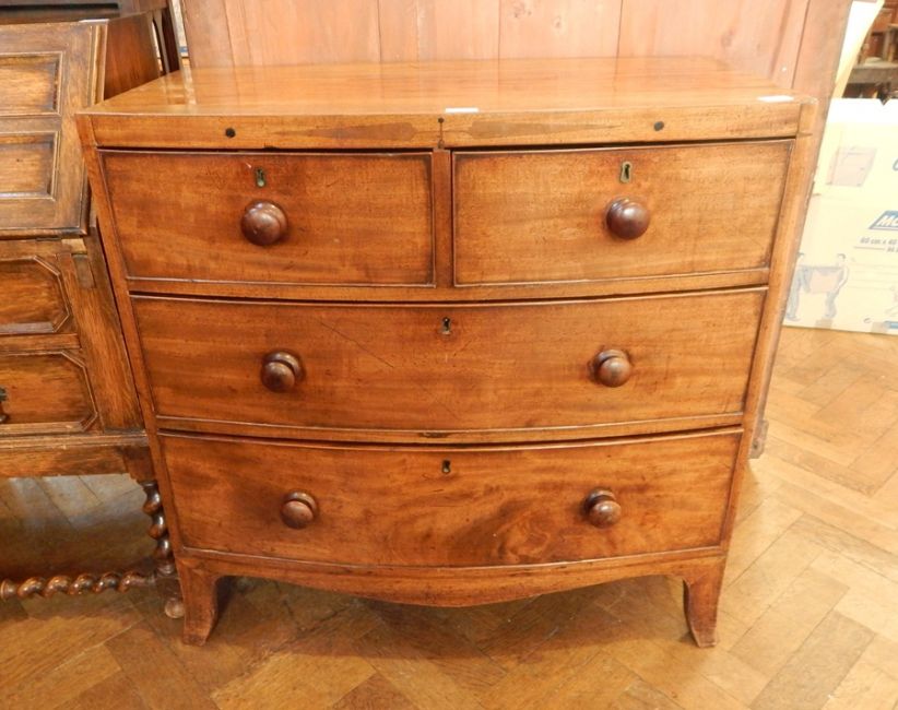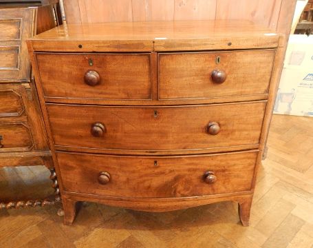 Georgian mahogany bowfront chest of two short and two long graduated drawers, with wooden handles, raised on splayed bracket feet, width 91cm