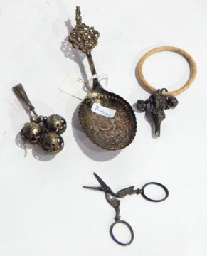 Foreign white metal serving spoon, baby's rattle with teething ring, another baby's rattle and whistle, marked sterling silver and a steel pair of scissors