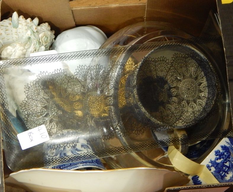Quantity blue and white ceramics, bisque wall vase, glass and other similar items (1 box)