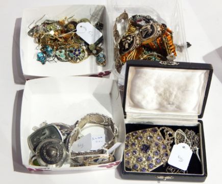 Silver-coloured filigree bracelet, another foreign silver-coloured bracelet and quantity costume jewellery including earrings