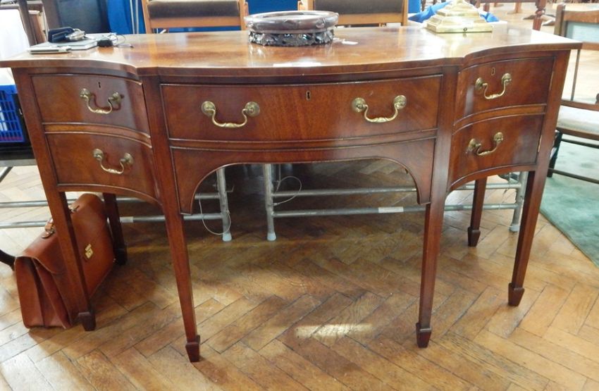 Georgian style serpentine fronted mahogany sideboard with one long and two short drawers, cupboard faced as two short drawers, with cockbead borders, brass swan neck handles, on square tapering supports and spade feet, 146cm wide