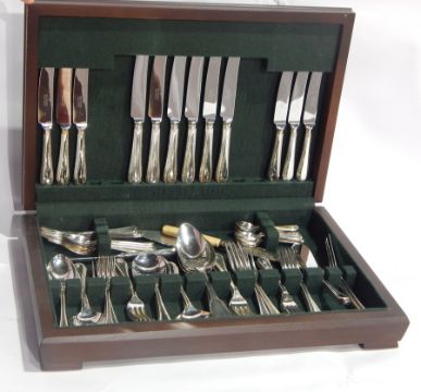 Canteen of silver plate cutlery, bead pattern, six place settings, to include dinner knives, forks, spoons, dessert spoons and forks, soup spoons, fish knives and forks, etc. in a fitted case