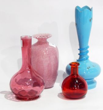 Cranberry glass ball and shaft vase of slightly lobed form, Edwardian opaque blue glass vase of shaped baluster form, mottled pink cased glass vase and a moulded necked bottle vase (4)