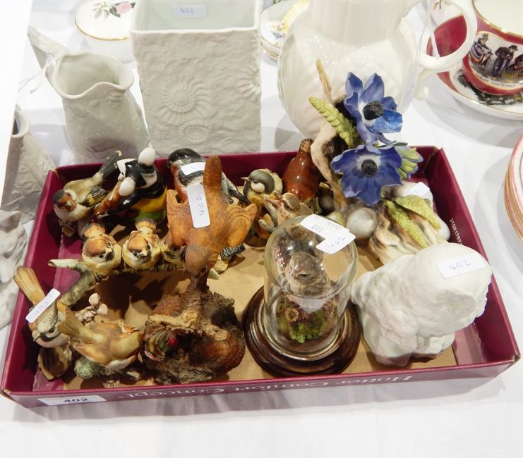 Kaiser bisque porcelain model of fox, another of an owl, Kaiser bisque porcelain slab vase, shell decorated, sundry bird models and other decorative ceramics