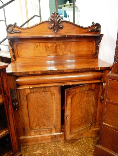 A Victorian rosewood chiffonier with a shelf back, cushion frieze drawer with a pair of panelled cupboard doors below enclosing shelf on a plinth base, width 117cm