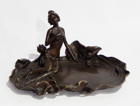 Bronze dish in the form of a girl, seated, in the Art Nouveau style, 22cms wide