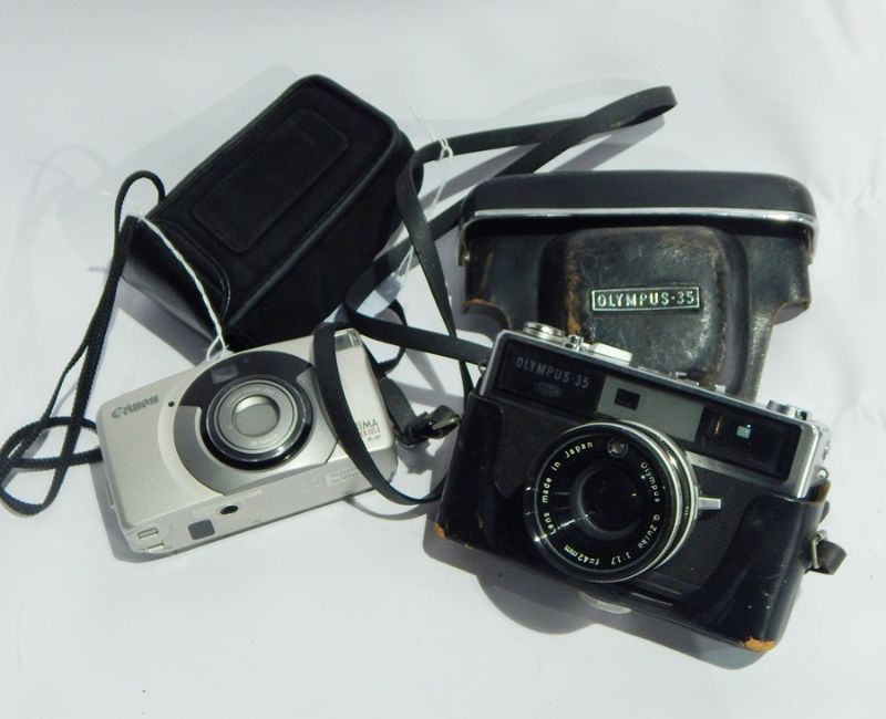 Two pewter warming pans, shaped dish, Olympus camera, another and a pair of Vanguard binoculars
