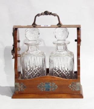 Stained wood silver plate mounted Tantalus with moulded glass rectangular decanters