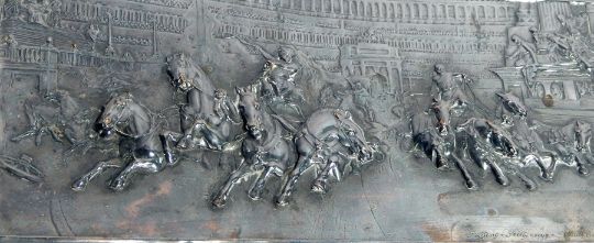 Rectangular silver plated relief plaque of chariot racing in the Colosseum, engraved bottom right "P.King. Fecit. 1905. (from engraving)", 14cm x 29cm, mounted on oak panel, 27cm x 42cm overall