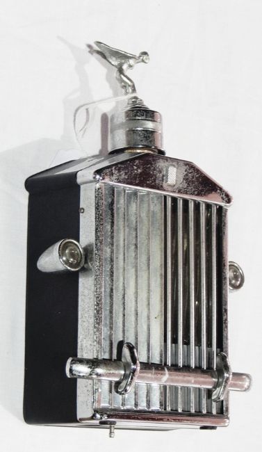 Rolls Royce musical "Swan Lake" decanter in the form of radiator grille, having Spirit of Ecstasy stopper, chrome and black plastic