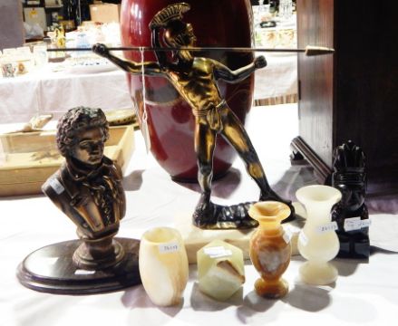A bronzed figure of a Greek god, possibly the God of War throwing a javelin, on a marble base, two marble posy vases, another vase and a paperweight, a carved African head and a bronzed bust of a Regency gentleman (7)