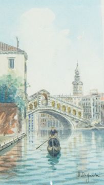 Umberto Ongania (1860-1896) Watercolour drawing Venetian canal scene with Rialto Bridge in background, signed bottom right, 18cm x 10cm