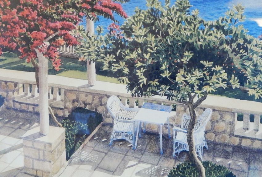 John Gillow 92 Limited edition print "Salcombe White Strand", boats moored in front of cottages, 93/350, 36cm x 26cm John Gillow 91 Limited edition print "Salcombe Estuary", hut with boats moored outside, 114/350, 36cm x 26cm Print Garden patio with trees overlooking the sea, signed indistinctly, 41cm x 30cm G Ashton 90 Limited edition print River scene with cottages and bridge, 85/426, 33cm x 26cm