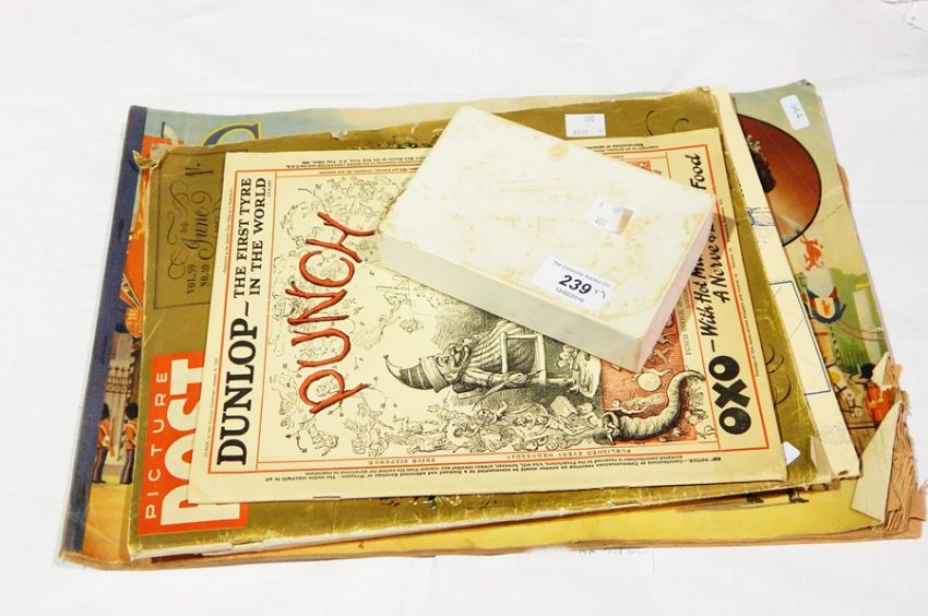 Scrapbook "Coronation Scrapbook 1955" with cuttings from newspapers, picture post Coronation souvenir number June 1953 along with a copy of Punch January 15th 1930, copy of the Times, Wednesday June 8th 1921, presentation travel sewing set P&O Ferries in original box, box camera, Ensign Ful-Vue camera in case, small vase and light/torch