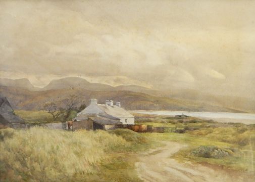 Charles James Adams (1859-1931) Watercolour Cottage with cows, beach, sea and hills in the background, 26cm x 38cm (Part of Charles James Adams' studio collection consigned by his great-great-granddaughter) Live Bidding: Some foxing to the top and middle of the picture