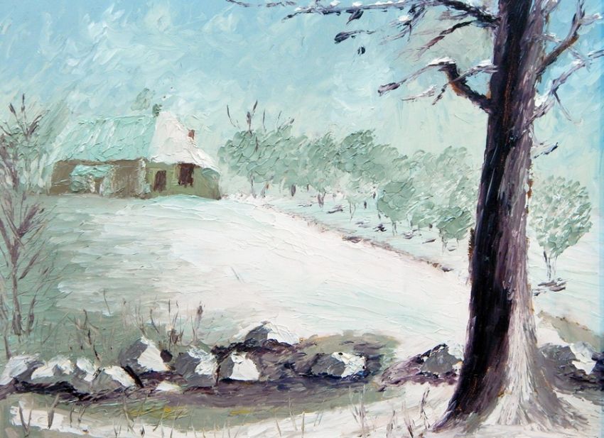 Contemporary English school Oil on board Winter landscape with cottage in background, signed "MK", 35cm x 45cm