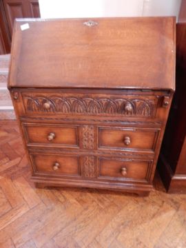 An oak bureau with fitted interior, with carved long drawer with two further drawers below raised on bracket feet, width 77cm