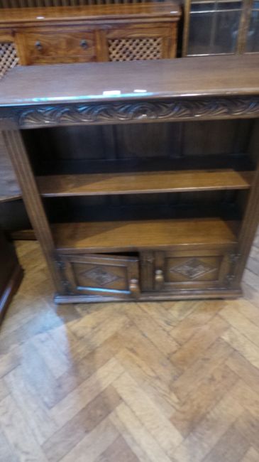 An oak open bookcase with foliate carved frieze, to open shelves with a pair of panelled cupboards below, width 85cm