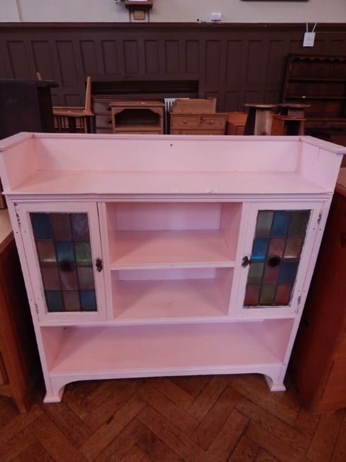 A pink painted Edwardian open bookcase, with a pair of coloured glass leaded light panelled doors, raised on block feet, width 109cm