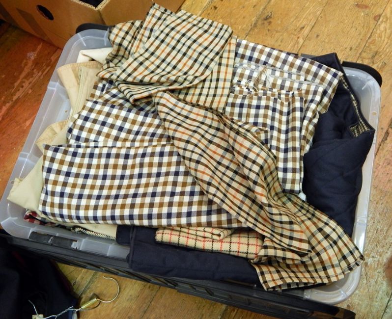 Various Aquascutum, Dax, Burberry, windcheaters, jackets, skirts, material, etc. (2 boxes)