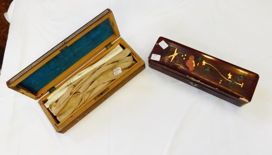 A leather glove box containing original glove stretchers, the base expanding for the gloves, the carry handle missing though the brass fittings present, the top ruled in gilt, a lacquer glove box, a carved Indian-style glove box (af) containing some gloves, a quantity of paper embroidery patterns within a wooden box, a bakelite marbled powder box and a boxed set of Oriental-style plastic liqueur glasses with matching tray (6)