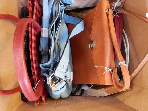 Various handbags including LK Bennett black patent leather, a black leather studded clutch bag, a vintage pigskin bag and others (1 box)