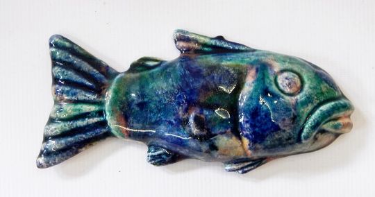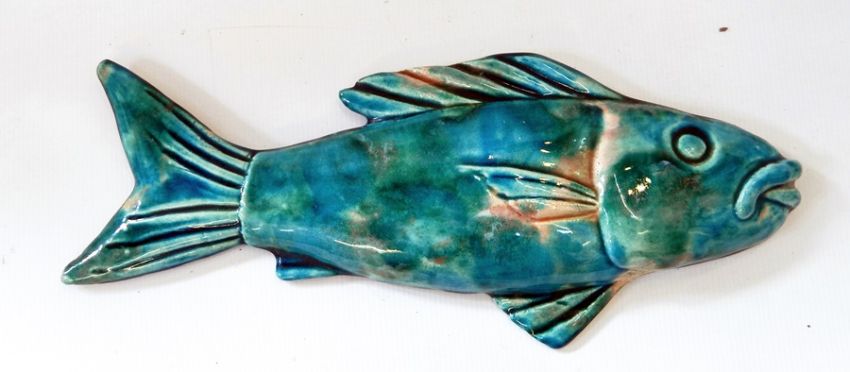 Kate Malone (b.1959) Earthenware moulded fish, wall mounting, greeny/peach glaze, 37cm long and two smaller wall-mounted fish of yellow, green and blue glazed, 19cm and 18cm long, all stamped "KM" to reverse, circa 1990 (3) Kate Malone (born 1959, London) after studying at Bristol Polytechnic 1979-1982 she went to Royal College of Art and on leaving in 1986 she worked in a studio in the Southbank Craft Centre at Charing Cross. She has exhibited widely, her work is held in the Victoria & Albert Museum, London, Manchester City Art Gallery, the Ashmolean Museum, Oxford and numerous galleries as well as on display in public areas, for example a set of fish sculptures for Lee Valley Park, Hackney Marshes Nature Reserve where there is a giant ceramic fish in the water. She has recently worked with EPR Architects where her involvement in 24 Savile Row won first place in the Wan Facade Award in 2015 and they were also a finalist in the 2016 Surface Design Awards, the project involved making 10,000 hand-glazed ceramic tiles. Malone's work is characterised by vibrant glazes and large sculptural pieces with vibrant colourful glazes. Recently she is well-known as a judge on the BBC2's Great Pottery Throw Down along with Keith Brymer-Jones and Sara Cox.