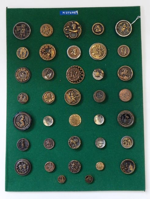 Various buttons set on card including picture buttons, steel buttons, flower design buttons (3 large cards)