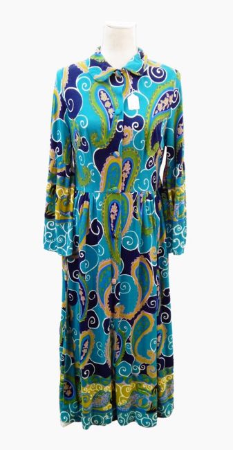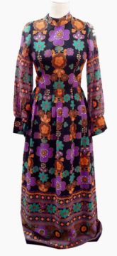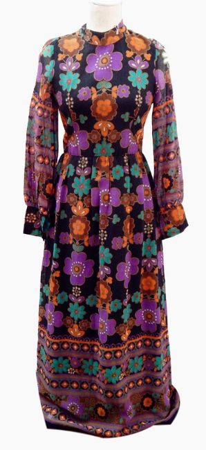 A 1960's psychedelic maxi dress by Marlow, button front, tie belt in turquoise, blue and purple, a 1960's dress by Jeannie, floral print on a black ground and a 1960's maxi dress in purple, browns and greens, printed on a black ground with a matching belt (3)