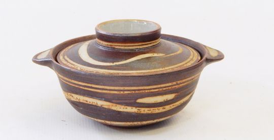 Quantity of studio pottery to include Swedish mottled-green oval dish, Danish two-handled bowl with incised exterior decoration and a further lidded pot of sinuous design (3)